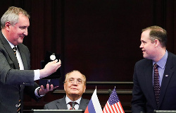 Директор NASA Джим Брайденстайн встретился с главой госкорпорации «Роскосмос» Дмитрием Рогозиным на космодроме Байконур в Казахстане.